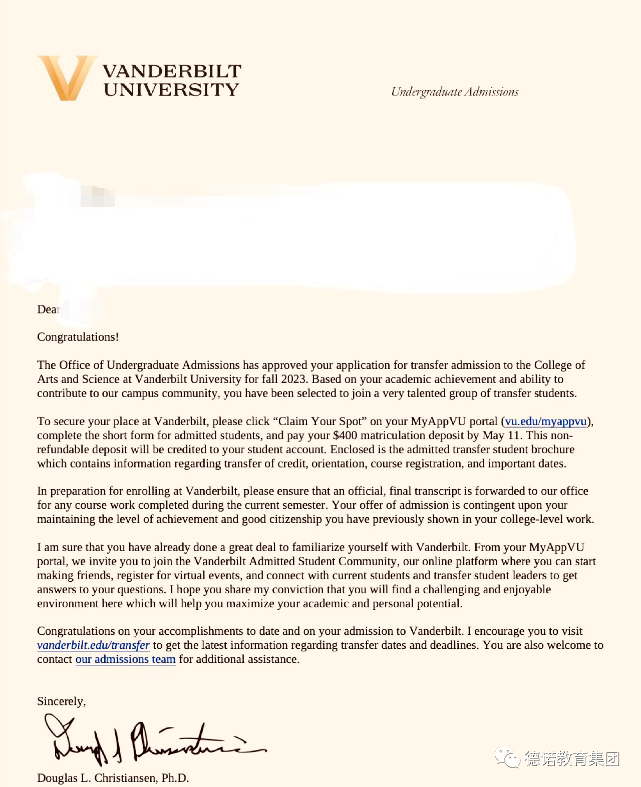 恭喜德诺Z同学获得全美第13名范德堡大学转学录取!