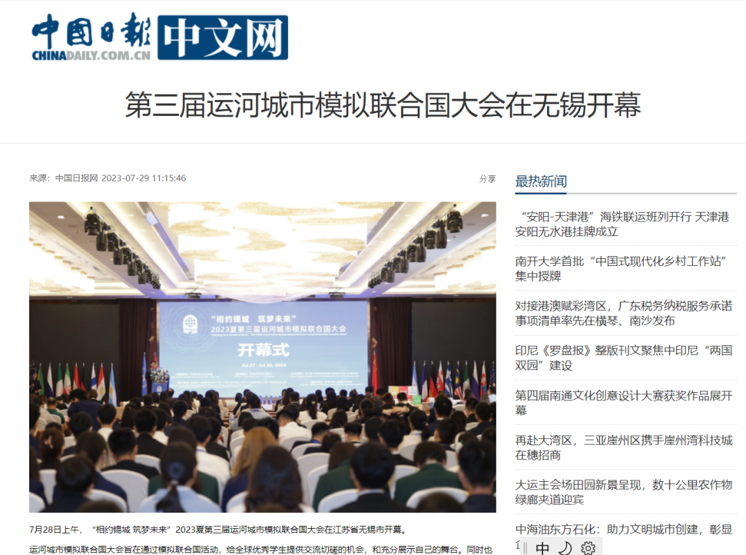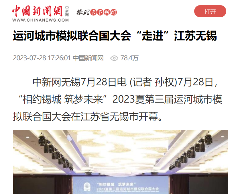7月27日至7月30日,2023 夏 第三届运河城市模拟联合国大会在江苏无锡举行。本次大会以“相约锡城 筑梦未来”为主题,由中国驻纽约总领事馆和江苏省人民政府外事办公室特别支持,联合国可持续发展目标全球协作项目工作委员会主办,费城世界事务理事会指导,无锡市人民政府外事办公室、无锡市教育局、无锡市人民政府妇女儿童工作委员会办公室协办,费城之窗、德诺国际教育承办,来自全世界的近300名学生代表参会。