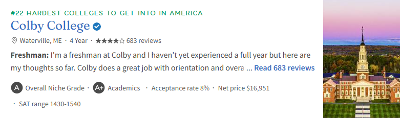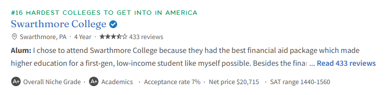 在今年的排名中,斯沃斯莫尔学院成为全美最难录取的文理学院,录取率为7%,相较去年下降了1%。